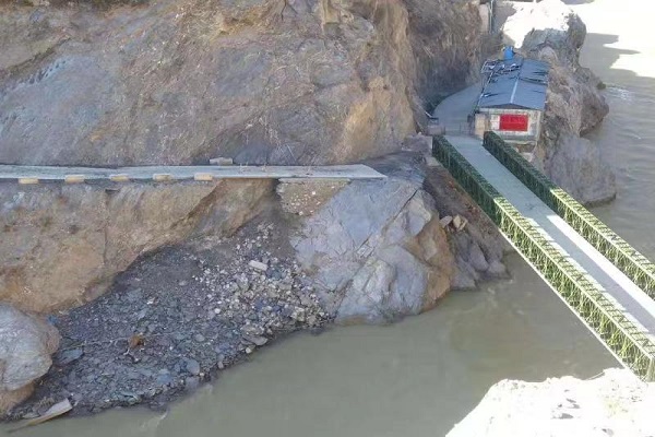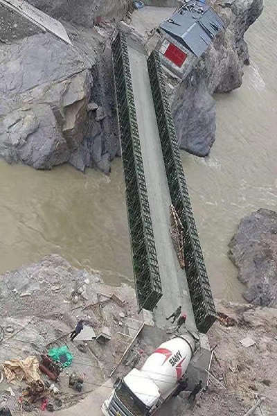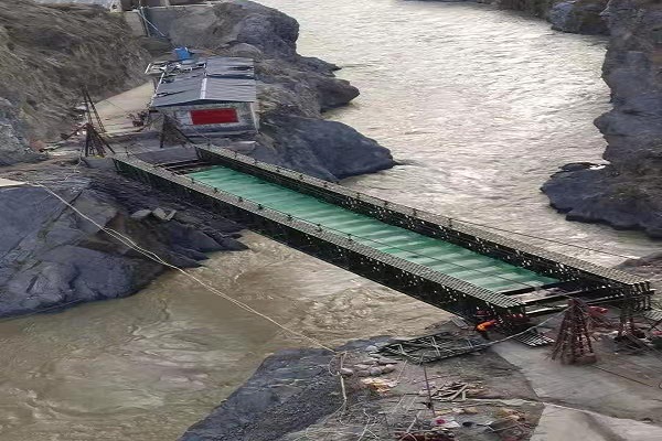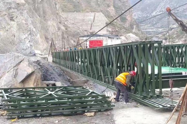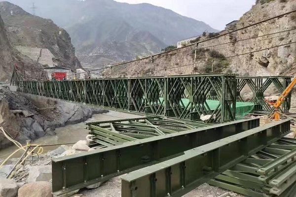 / Contact US 江苏贝雷钢桥有限公司派专门的技术人员前往甘肃省甘南藏族自治州迭部县,生产桥型四排单层加强型(QSR)钢桥,贝雷钢桥生产的钢桥使用200型产品,全桥长45.72米,属于单跨桥,整个桥面净宽 4.2米,荷载55吨。