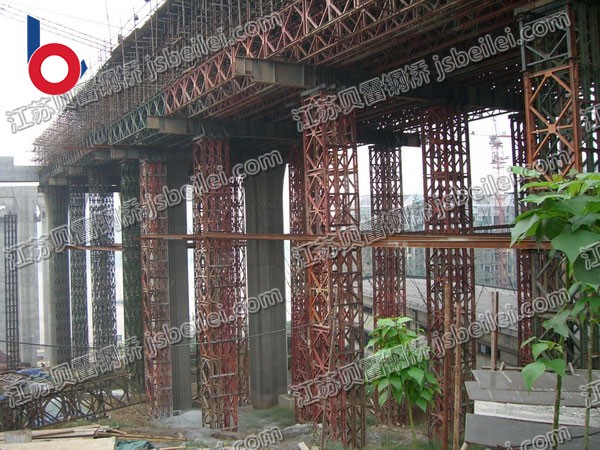 拉杆端部有凸头,安装时将拉杆凸头扣入横梁垫板缺口,悬梁的一端勾在析架竖杆的长方孔上,然后用拉杆(或扳手)转动支撑杆,使其压紧固定横梁。横梁夹不能承受很大的向上载荷。因此,当横梁用夹具夹住时,禁止用千斤顶在横梁下顶部。纵梁有两种类型:纵梁和无扣纵梁。有扣梁上焊接扣子,桥面两侧焊接扣子,桥面榫头安装在扣子上,桥面两侧。